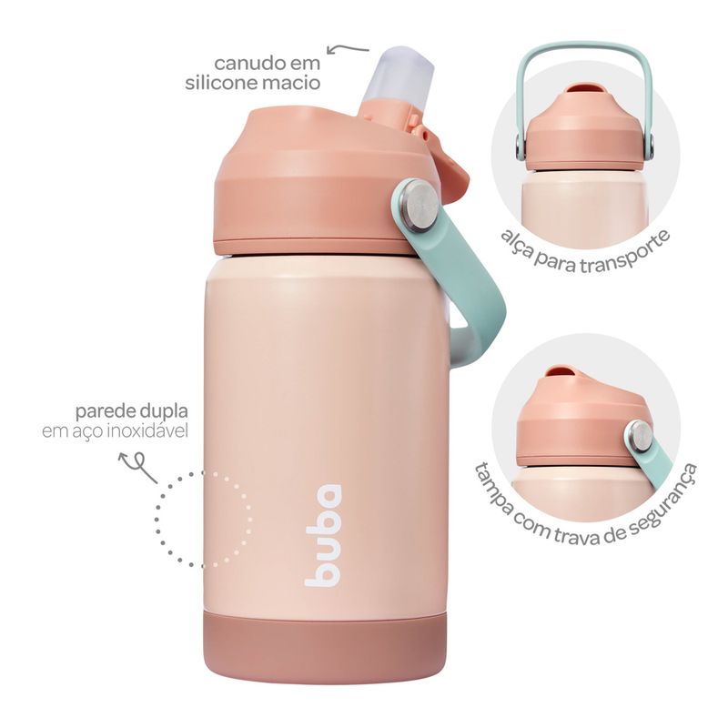 A Garrafa Térmica Parede Dupla da Buba ajuda a conservar a temperatura do líquido (quente ou frio) por mais de 5 horas. Pode ser utilizada para armazenar água, sucos ou chás. Produzido em aço inoxidável com parede dupla, é resistente e higiênico. Possui trava de segurança e alça para carregar, ideal para levar em passeios e viagens. Capacidade 360ml, livre de BPA.
