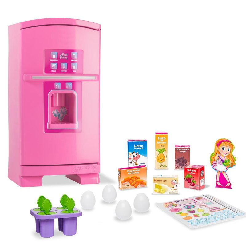 Essa linda geladeira tem um tamanho grande e encorpado. Com 50 cm de altura, e diversos acessórios para brincar, ela tem um dispenser lúdico na porta, prateleiras internas, porta-ovos com 4 ovos, fôrma para fazer picolé, cartela de adesivos e caixinhas para recortar e montar que tornam a brincadeira ainda mais lúdica e divertida!