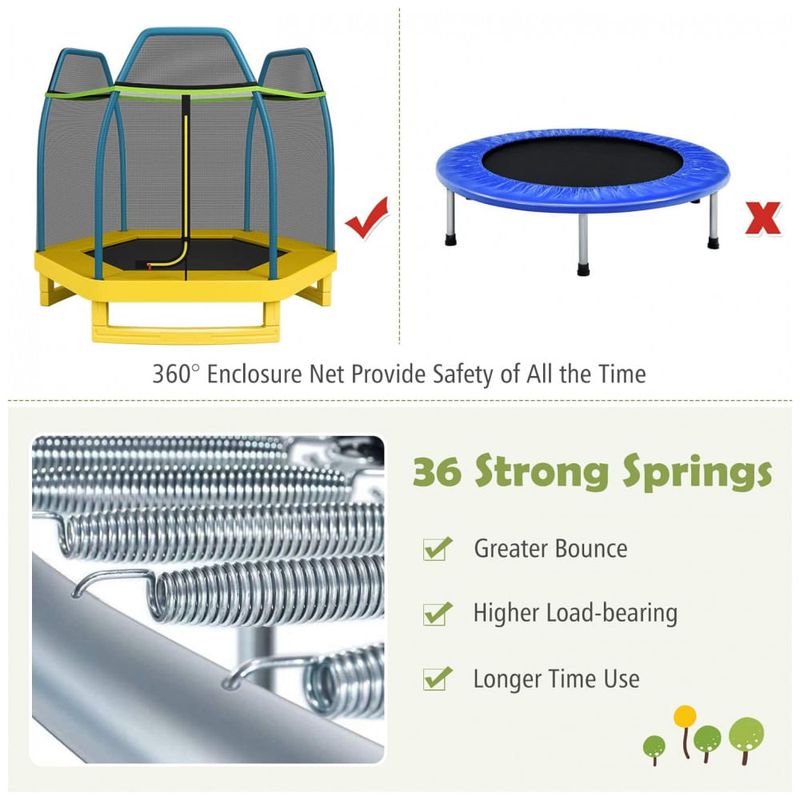 Zíper de dois lados com design de fivela O trampolim para crianças está equipado com zíper em forma de L de dois lados com fivela para garantir o fechamento duplo. Existem 36 cordas fortes para maior ressalto, maior suporte de carga e maior tempo de uso. Além disso, o tapete de salto de alta qualidade é resistente a rasgos, proporcionando proteção segura e forte ressalto.