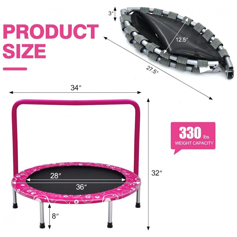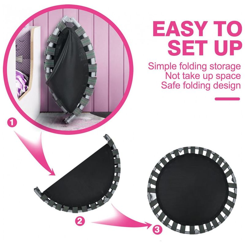 Design dobrável Depois de remover a alça, a tampa e as pernas, as outras partes deste mini trampolim leve podem ser facilmente dobradas em tamanho compacto. Como resultado, você é capaz de carregá lo sem esforço. E o zenamento fica mais fácil para economizar espaço em sua casa.