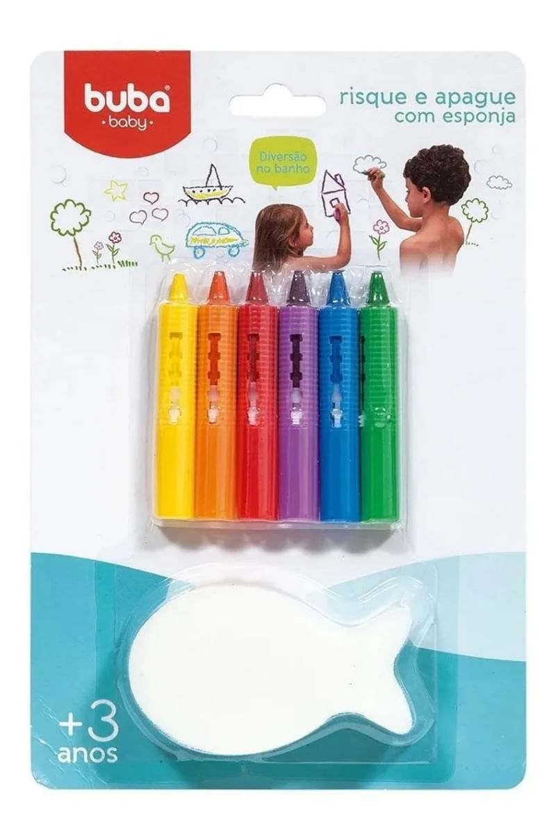 Contém - 6 giz para usar no banho e esponja em formato de peixinho
