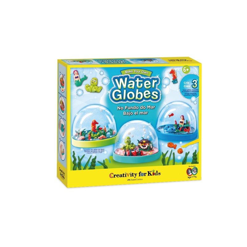 CRIE 3 GLOBOS DE ÁGUA - esse Kit de atividades permite criar 3 globos de água inspirados no fundo do mar. As crianças podem decorar os globos com massinha, glitter e 3 bonecos em miniatura como sereia, cavalo-marinho e polvo.