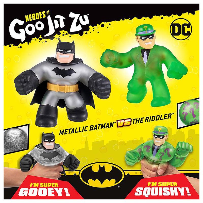 Os super-heróis da DC e os heróis de Goo Jit Zu combinaram forças para trazer a linha definitiva dos super-heróis mais elásticos, gosmentos e macios de todos os tempos! Existem 2 Heróis no Pacote Versus: Batman Metálico e Charada. Cada Herói é exclusivo e só pode ser encontrado neste pacote. O Batman Metálico é super pegajoso! Aperte e estique seu corpo para ver o lodo metálico se mover dentro de seu corpo! O Charada é super fofo! Aperte o corpo dele e veja o lodo sair para revelar pontos de interrogação dentro dele! Colete todos os heróis Goo Jit Zu DC! Cada Herói tem um recheio de gosma único!