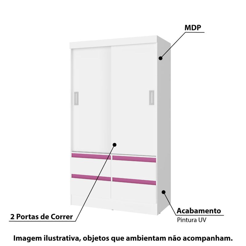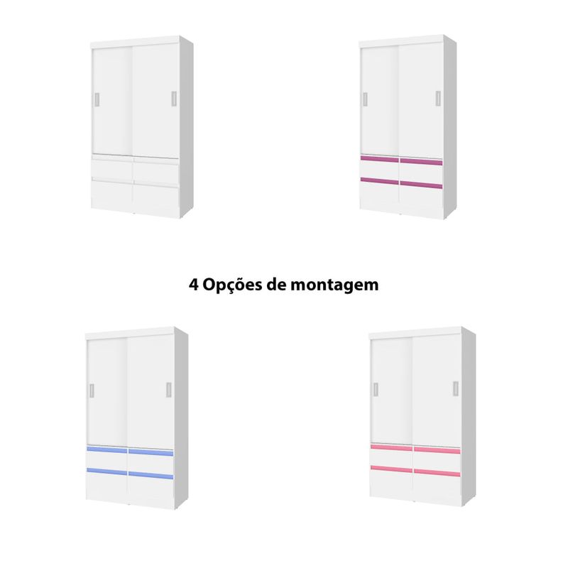 O Guarda Roupa 2 Portas da San Marino é para você que tem pouco espaço no quarto, mas tem muita roupa. De estrutura compacto e parte interna com muito espaço, bem funcional. São 2 portas de correr, 4 gavetas, 2 prateleiras, 1 cabideiro e puxadores em ABS cromado. E para deixar o ambiente descontraído as cores dos apliques decorativos sob as gavetas é conforme sua escolha, rosa, azul, lilás ou branco. Todas as opções vão junto a embalagem e você troca quando quiser. Um excelente recurso para você deixar o quarto sempre de cara nova.