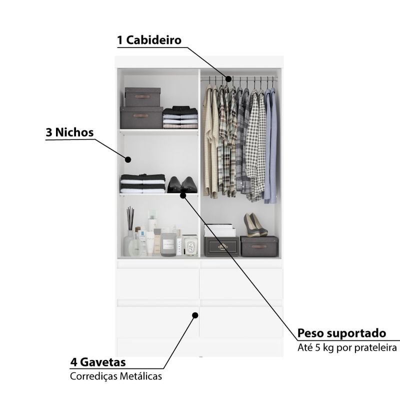 - Peso suportado: 5 kg por prateleira e 3 kg no cabideiro.