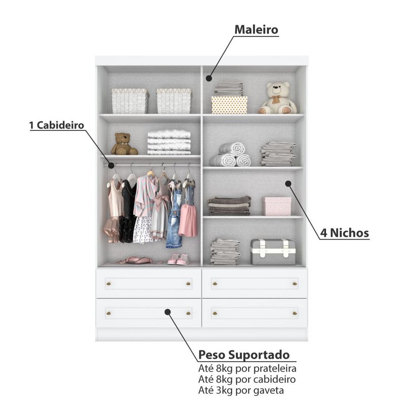 - Peso suportado por prateleira: 8 kg