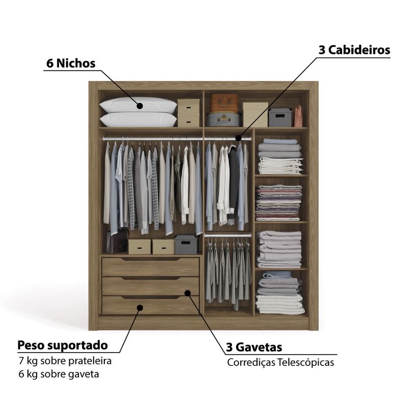 O Guarda Roupa da Kappesberg, além de sua elegância e qualidade, é versátil, ele leva modernidade ao seu quarto.Conta com 2 portas de correr, 3 cabideiros, 3 gavetas com corrediça telescópicas e 6 nichos. Tudo isso para deixar seu ambiente ainda melhor.