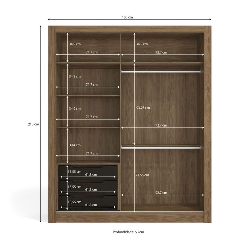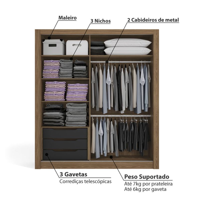 Guarda Roupa com 2 Portas de Correr e 3 Gavetas - Nogueira