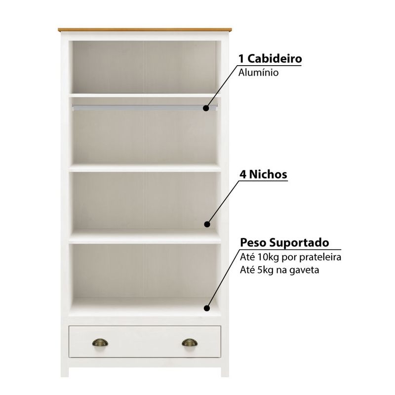 - Peso suportado: Até 10kg por prateleira, 5kg na gaveta e 8kg no cabideiro (peso distribuído)