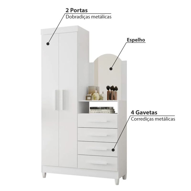O Guarda-Roupa com cômoda Capri tem design moderno e despojado. Uma única peça, compacta, mas muito funcional, deixando todas suas roupas e objetos muito bem arrumados. O armário 2 portas, 1 prateleira e 1 cabideiro, já a cômoda é com 4 gavetas, 1 prateleira interna, 1 nicho e 1 espelho. Uma excelente escolha para você, que deixar o quarto organizado e super bem decorado!