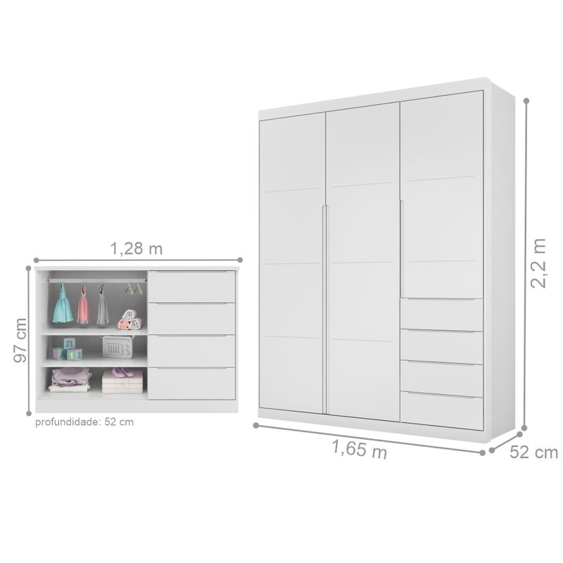 Guarda roupa possui 4 gavetas com corrediças telescópicas, puxadores cava e 3 portas.