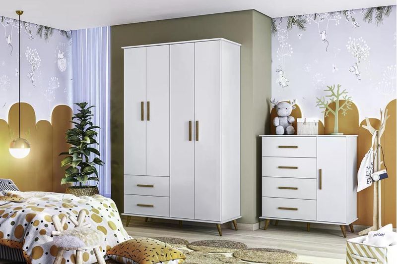 Guarda Roupa e Cômoda Infantil Retrô Noah, são os móveis que faltavam para garantir um dia a dia mais organizado e um ambiente infantil bem decorado com qualidade, com estrutura em MDP bio-sustentável de 15 mm, acabamento em pintura UV (Fosco e Brilho), sua pintura acetinada é feita diretamente na madeira tratada. Conta com portas com dobradiças metálicas, gavetas com corrediças metálicas, prateleiras internas com muito espaço para roupas, cabideiro, puxadores em MDF, possui pés palito reforçados em madeira e modelo Retrô, com design compacto e delicado, móveis perfeitos para transformar o quarto em um lugar aconchegante e atraente, sem abrir mão da qualidade. Estes móveis chegarão em sua casa separados em 03 volumes.