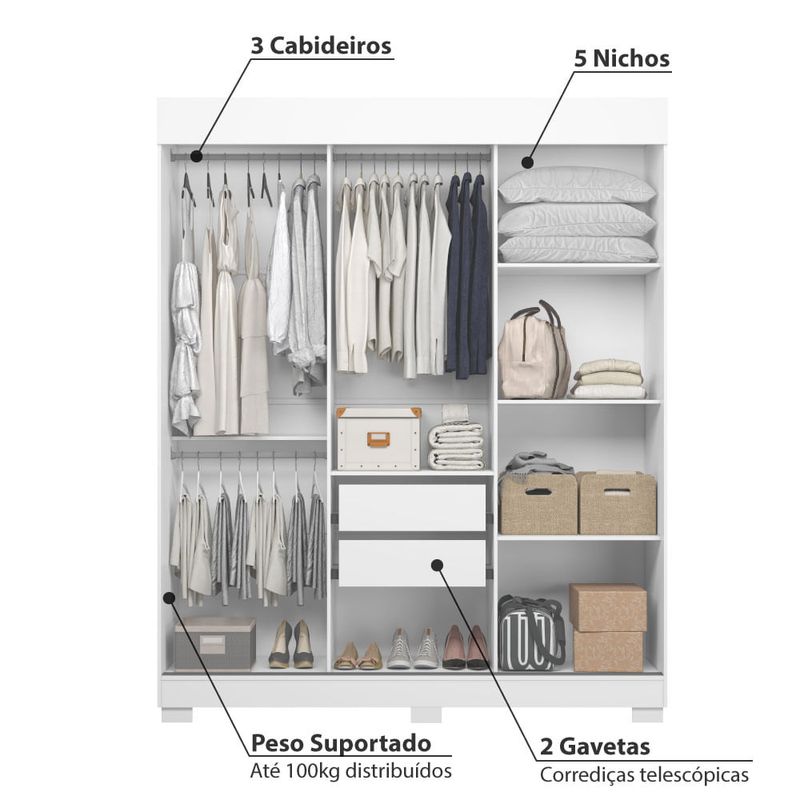 O Guarda Roupa Estiletto é moderno e funcional, suas portas deslizantes permite um maior aproveitamento do ambiente, ideal para quarto pequeno. São 3 portas de correr. Com 2 gavetas com corrediças telescópicas, 5 nichos e 3 cabideiros em alumínio. Incrível né?. A Estrutura em MDP sendo caixaria, portas e gavetas de 15 mm.