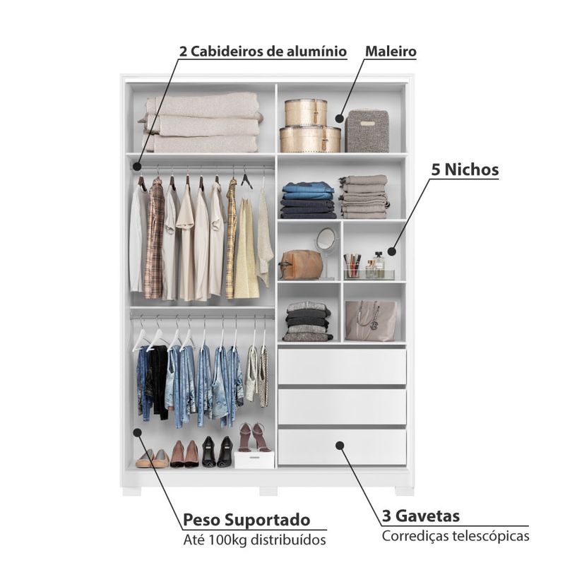 O Guarda Roupa Frizatto é moderno e funcional, suas portas deslizantes permite um maior aproveitamento do ambiente, ideal para quarto pequeno. São 2 portas de correr. Com 3 gavetas com corrediças telescópicas, 5 nichos, maleiro amplo e 2 cabideiros em alumínio. Incrível né? A Estrutura em MDP sendo caixaria, portas e gavetas de 15 mm.