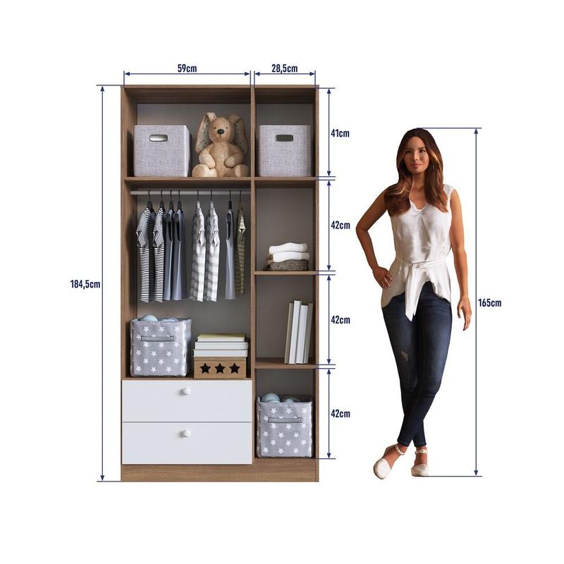 Com um design moderno, esse guarda roupa infantil mede apenas 92cm de largura, perfeito para um ambiente com pouco espaço. Mas apesar de ser compacto, pode acomodar muitas roupas e demais itens do bebê. Você pode aproveitar o cabideiro para pendurar várias peças, ganhando espaço abaixo delas para dispor toalhas, fraldas e o que mais precisar. Além disso, ainda conta com 4 prateleiras laterais, 1 nicho superior e duas gavetas que também servem para manter tudo organizado. Assim você gasta menos tempo com arrumação e mais tempo com o seu bem mais precioso: o seu bebê!