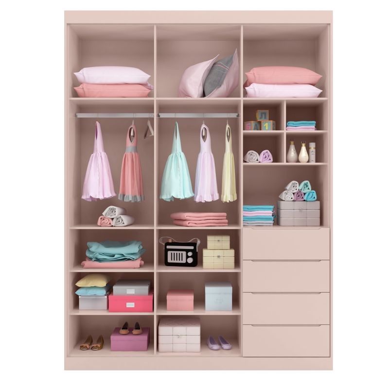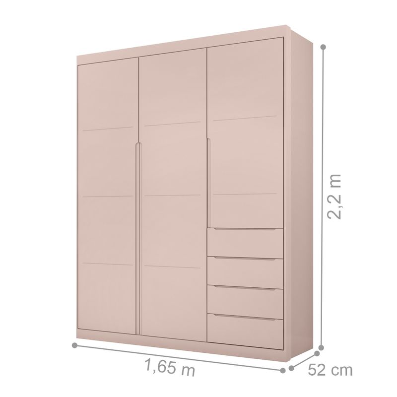 O guarda roupa possui 4 gavetas com corrediças telescópicas e puxadores cava.