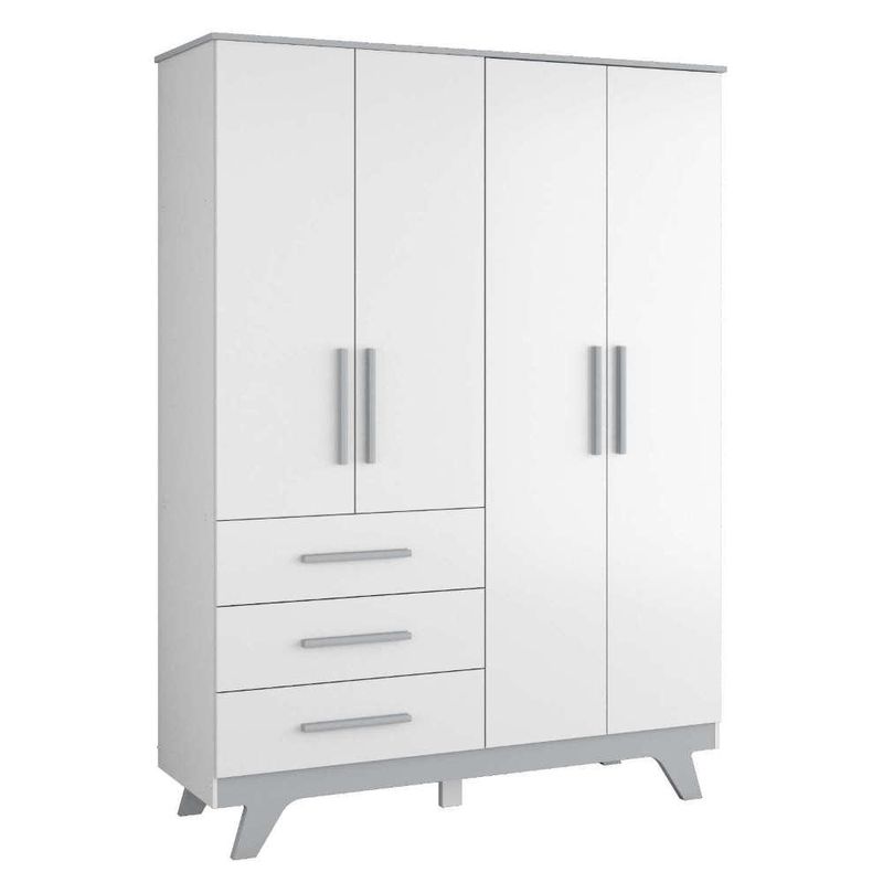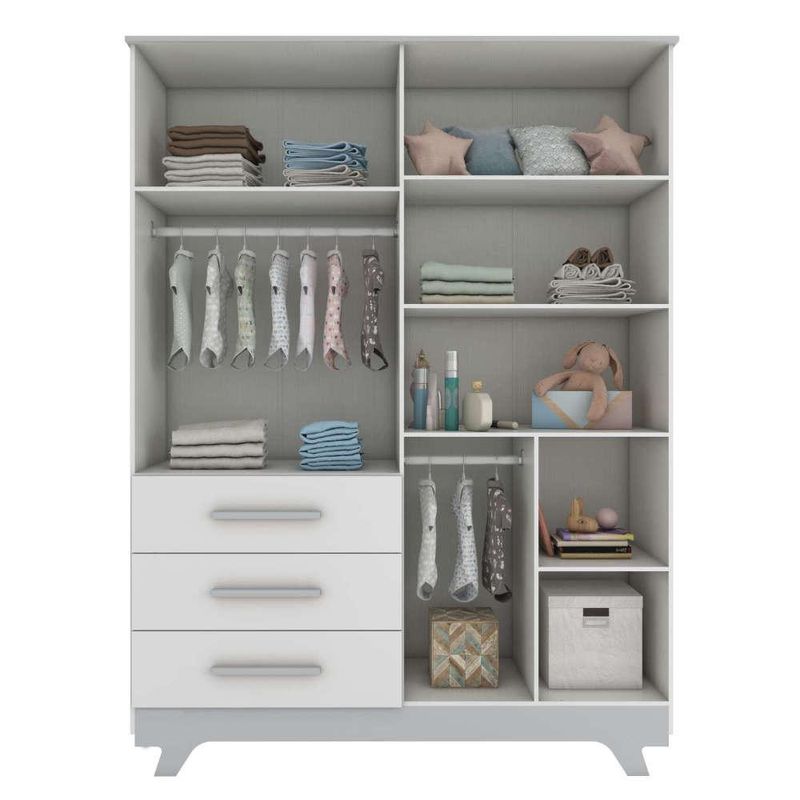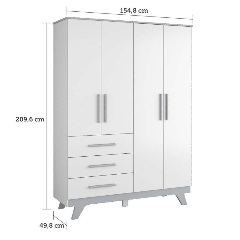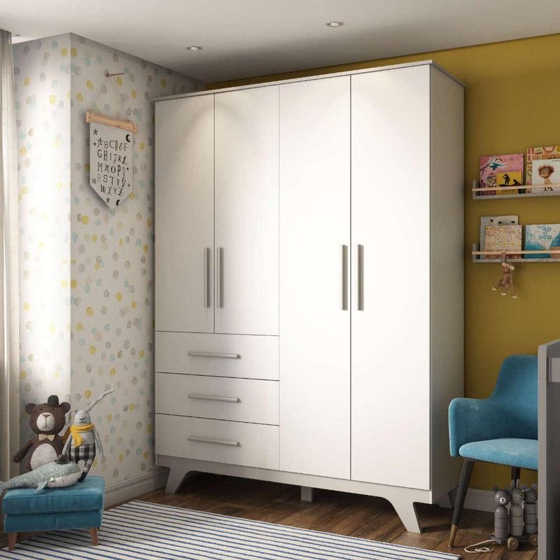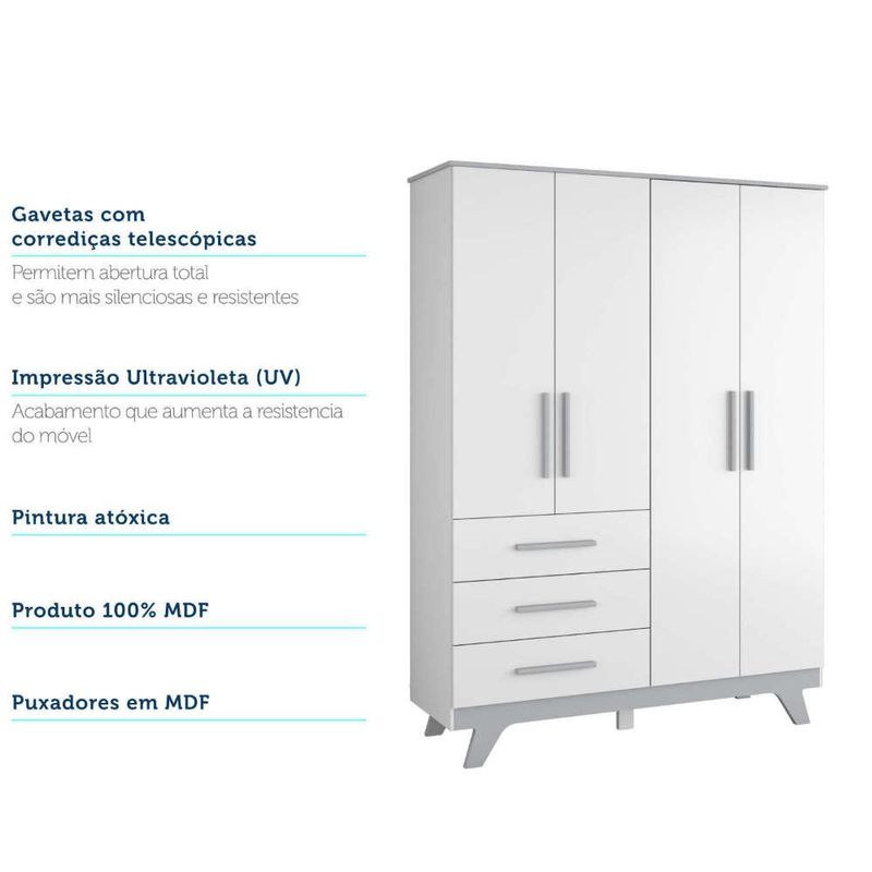 O Guarda Roupas Retrô encanta pelas suas linhas retas, inspirado no estilo passado com um toque de modernidade para o quarto do seu bebê. Ainda conta com muito espaço para manter tudo bem organizado. Com pintura atóxica, 3 gavetas que deslizam suavemente em corrediças metálicas telescópicas, conforto, durabilidade e segurança no abrir e fechar. Conta ainda com 4 portas, 2 cabideiros metálicos e 5 prateleiras. Qualidade de ser em 100% MDF.