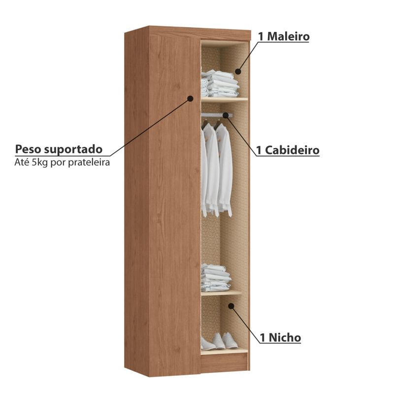 O Guarda Roupa Modulado Infinity é versátil, pois possibilita você acrescentar opções de módulos conforme seu desejo e necessidade. Ele é perfeito para colocar no canto do quarto, fazendo com que você aproveite todos os espaços. Conta com 1 porta com dobradiças metálicas, 1 nicho, 1 cabideiro, 1 maleiro com muito espaço para guardar suas roupas e sapatos. E, se você desejar ampliar esse móvel, bastar comprar e associar outros módulos Infinity ao roupeiro, mas antes, verifique a medida e o desenho do seu espaço para certificação dessa incrível possibilidade.