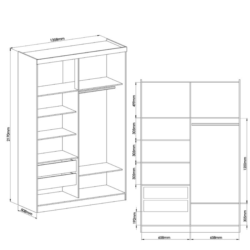 O Guarda Roupa Modulado Infinity é versátil, pois possibilita você acrescentar opções de módulos conforme seu desejo e necessidade. Ele é perfeito para colocar no canto do quarto, fazendo com que você aproveite todos os espaços. Conta com 2 portas de correr, 1 cabideiro, maleiro amplo, 2 gavetas e 5 nichos com muito espaço para guardar suas roupas e sapatos. E, se você desejar ampliar esse móvel, bastar comprar e associar outros módulos Infinity ao roupeiro, mas antes, verifique a medida e o desenho do seu espaço para certificação dessa incrível possibilidade.