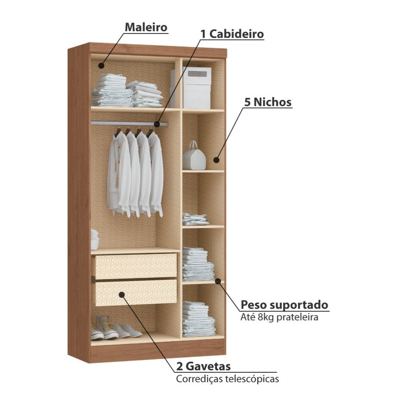 O Guarda Roupa Modulado Infinity é versátil, pois possibilita você acrescentar opções de módulos conforme seu desejo e necessidade. Ele é perfeito para colocar no canto do quarto, fazendo com que você aproveite todos os espaços. Conta com 3 portas com dobradiças metálicas, 5 nichos, 2 gavetas, maleiro amplo e 1 cabideiro com muito espaço para guardar suas roupas e sapatos. E, se você desejar ampliar esse móvel, bastar comprar e associar outros módulos Infinity ao roupeiro, mas antes, verifique a medida e o desenho do seu espaço para certificação dessa incrível possibilidade.
