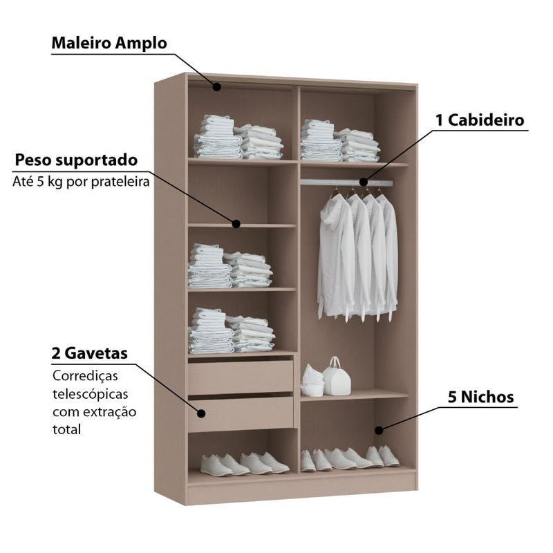 O Guarda Roupa Modulado Requinte é versátil, pois possibilita você acrescentar opções de módulos conforme seu desejo e necessidade. Conta com 2 portas de correr, 5 nichos, 1 cabideiro, 1 maleiro amplo e 2 gavetas com muito espaço para guardar suas roupas e sapatos. E, se você desejar ampliar esse móvel, bastar comprar e associar outros módulos Requinte ao roupeiro, mas antes, verifique a medida e o desenho do seu espaço para certificação dessa incrível possibilidade.