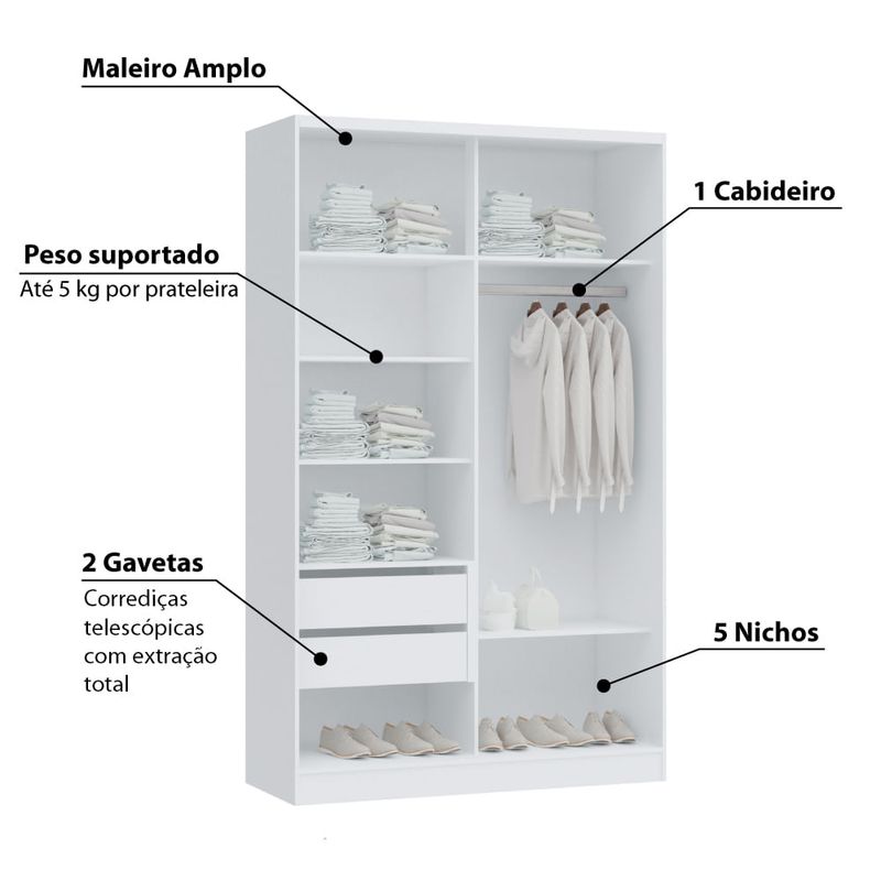 O Guarda Roupa Modulado Requinte é versátil, pois possibilita você acrescentar opções de módulos conforme seu desejo e necessidade. Conta com 2 portas de correr, 5 nichos, 1 cabideiro, 1 maleiro amplo e 2 gavetas com muito espaço para guardar suas roupas e sapatos. E, se você desejar ampliar esse móvel, bastar comprar e associar outros módulos Requinte ao roupeiro, mas antes, verifique a medida e o desenho do seu espaço para certificação dessa incrível possibilidade.