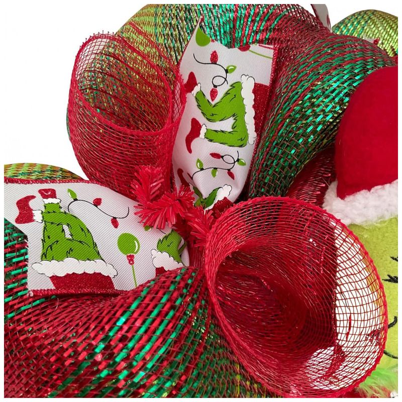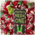 Este exuberante e divertido guirlanda natalina artesanal "You're a Mean One Green Monster" é o destaque perfeito para quem deseja adicionar personalidade e bom humor à decoração de Natal! Se destaca pelo design premium totalmente feito à mão em deco mesh metálico, com tons vivos de vermelho, verde limão e verde esmeralda, refletindo o espírito festivo e irreverente do famoso "monstro verde". Uma placa central de madeira com o letreiro "You're a Mean One" repousa sobre a base vermelha, decorada com letras verdes brilhantes e pernas felpudas de monstro, criando uma atmosfera encantadora e única. O acabamento se destaca pelos detalhes: borda listrada de vermelho e branco tipo bala, pelúcia sorridente no topo, laço de mesh com fitas personalizadas, e ornamentos em diferentes texturas, além de fitas que simulam pernas de duende e luzes natalinas ao redor do arranjo. Tudo isso é combinado para criar uma peça cheia de charme, expressividade e qualidade artesanal superior.