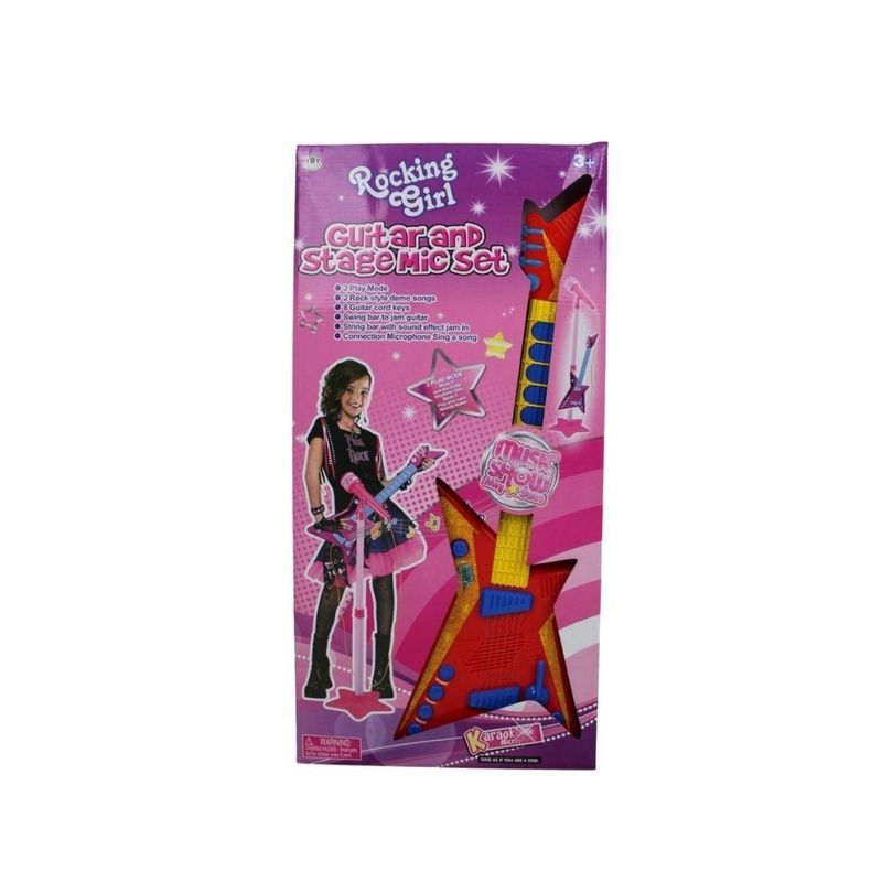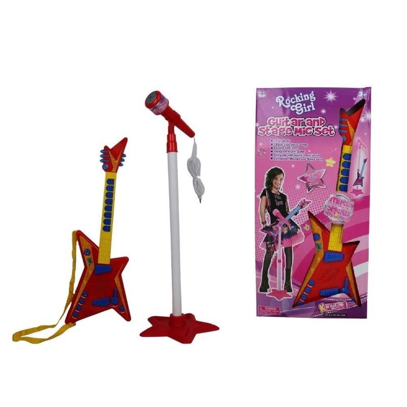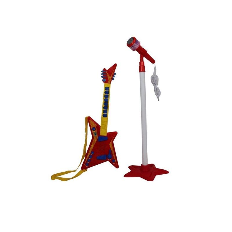 Incentive o interesse de seus filhos pela musica, obtendo esta bela guitarra e microfone. Este brinquedo é fácil de usar é um conjunto musical que tem melodias pré-carregadas que seu filho(a) pode dançar e ainda tem o microfone para poder explorar suas habilidades de canto.