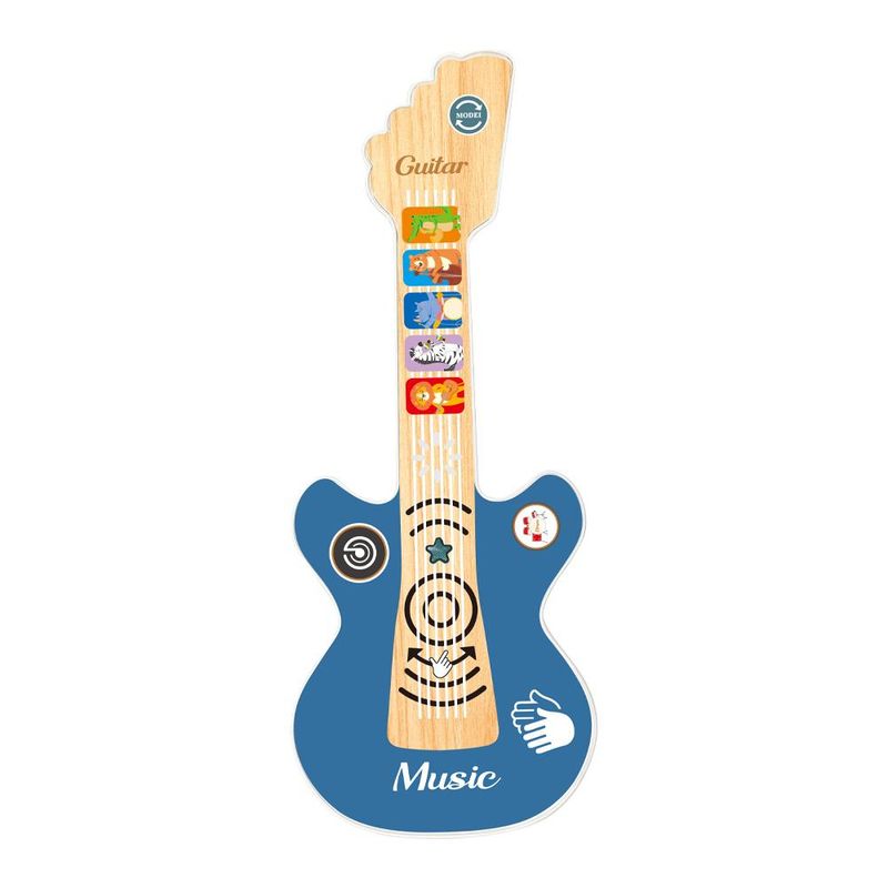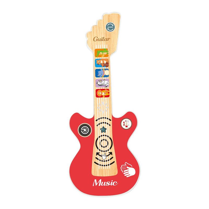 • Guitarra touch; • Reproduz diferentes melodias; • Alterna entre os 3 modos de reprodução: música, animais e piano; • Reproduz sons de instrumentos musicais (modo música), sons dos animais (modo animais) e teclas de piano (modo piano); • Toca 2 sons de bateria; • Reproduz aplausos.\n\nIdade recomendada:12-18 meses;Composição/Material:Plástico;Funciona com pilhas:Não;Brinquedo com luz:Não;Brinquedo com som:Não;Dimensões:22,7x48x5 cm;Peso:0,454 kg;Código de Barras:7899788409012;Garantia do Fornecedor:3 Meses contra defeito de fabricação;