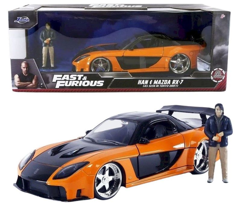 Han e Mazda RX-7 - Velozes e Furiosos Tokyo DriftMarca do produto: Jada.Coleção: Hollywood Rides.Escala: 1/24 (aproximadamente 20 cm de comprimento).Inclui action figure do Han. Pneus de Borracha.Abre as Portas, Capô e Porta-Malas.Miniatura em Metal com partes de plástico.