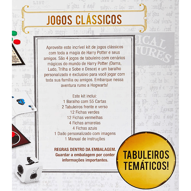 São 4 jogos de tabuleiros diferentes (Dama, Ludo, Trilha, Sobe e Desce) e 1 baralho para você jogar com sua família ou amigos, embarcando nessa aventura para Hogwarts!