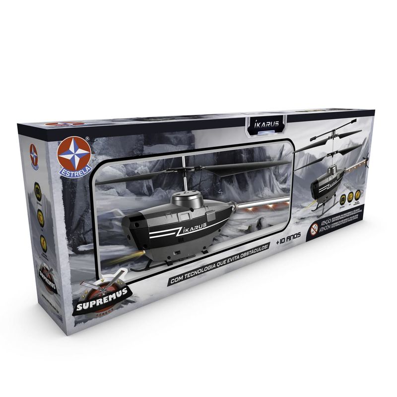 O Supremus Íkarus é um helicóptero de controle remoto movido a bateria recarregávelSua carroceria é de plástico com eixo de metal, e possui luzes chamativas em sua caudaAlém disso, ele possui uma tecnologia avançada de estabilidade Gyro, que proporciona voos suaves e controlados, além da capacidade de evitar obstáculos com muita maestriaCom manobras das mais simples as mais avançadas o Ikarus é diversão garantidaSua bateria leva 40 minutos de carregamento e tem tempo de uso de 8 minutos, o controle requer 2 pilhas AAPeças: