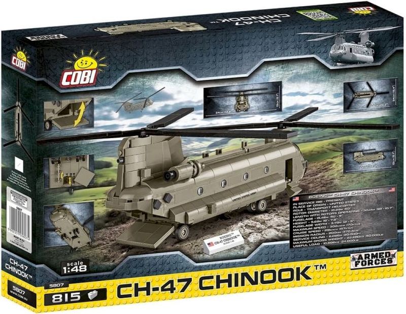 Helicóptero De Transporte Militar Ch-47 Chinook #5807 Marca do produto: Cobi (Made in Poland). Peças: 815. O CHINOOK é um poderoso helicóptero militar bimotor multifuncional produzido continuamente desde 1961. Suas características são sua forma de banana e duas hélices girando em direções opostas, o que permitiu livrar-se do rotor vertical. Todo o seu poder considerável é usado para elevação vertical. O helicóptero pode viajar a velocidades de até 278 km/h. Foi criado para o transporte de soldados e equipamentos militares. É um design muito popular e eficaz, associado desde a Guerra do Vietnã ao Exército dos EUA. Até hoje, o número de usuários deste helicóptero em todo o mundo permanece considerável.A partir do kit de blocos de construção COBI, você pode construir a escala 1:48 cuidadosamente projetada do imensamente popular helicóptero americano CH-47 CHINOOK. O modelo foi coberto com estampas de alta qualidade que não se desgastam mesmo durante a diversão intensa. As estampas imitam a pintura do veículo nas cores dos EUA e imitam os detalhes do CHINOOK. O helicóptero está equipado com hélices rotativas e uma aba de abertura. Uma corda com um gancho de captura sai do fundo do helicóptero para diversão adicional! Duas figuras piloto também estão incluídas. A COBI está no mercado há mais de 30 anos e todos seus produtos são feitos na Polônia. Todos os produtos COBI são compatíveis com outras marcas. As coleções são todas regularizadas e licenciadas pelas marcas.