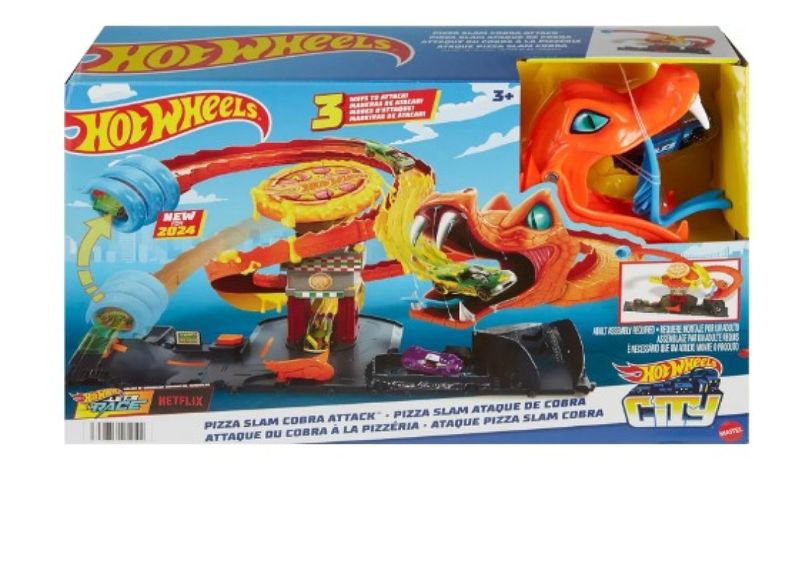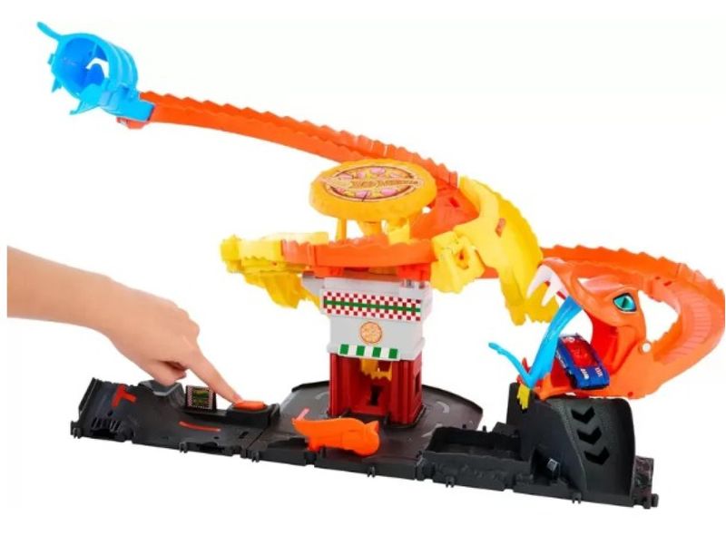 Enfrente uma cobra faminta que entrou na pizzaria e salve a Hot Wheels City, assim como na série "Lets Race" da Netflix!