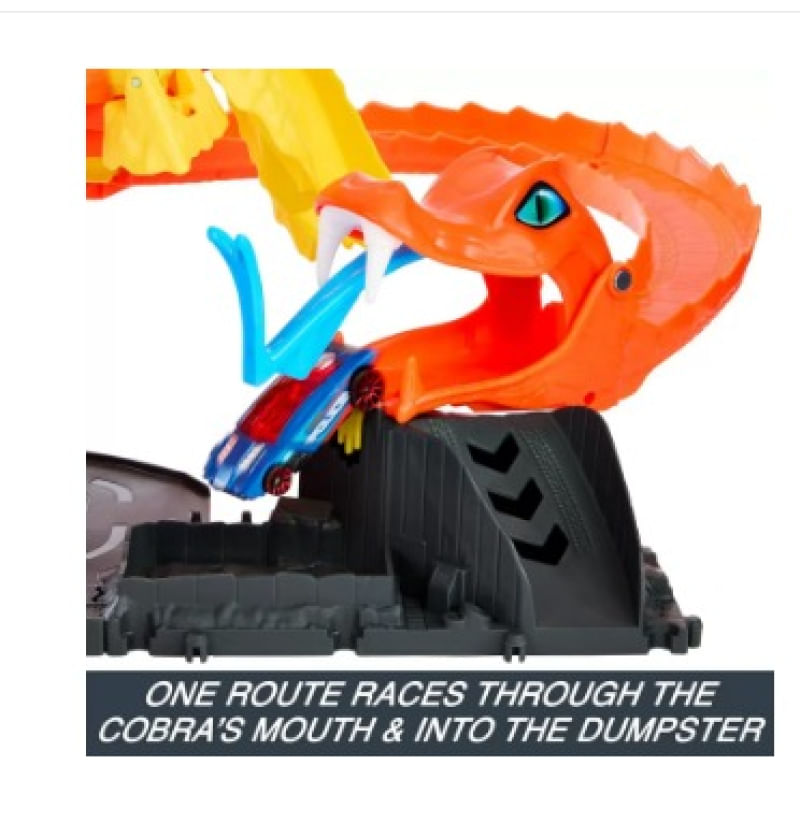 Dirija até a cauda da cobra e solte-a para ver qual dos três caminhos aleatórios o carro tomará. Vai correr pela boca da cobra e acabar no contentor do lixo? Talvez tenha o infeliz passeio que termina na boca da criatura. Ou talvez ele envie uma torta de pizza para o rosto da cobra, derrotando-a! O conjunto apresenta detalhes legais de pista para inspirar aventuras de contar histórias e pode se conectar a outros conjuntos Hot Wheels City para brincadeiras abertas. Cada um é vendido separadamente. Um carro Hot Wheels está incluído.