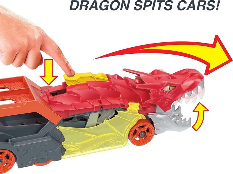 Dragões regulares cospem fogo, mas o Hot Wheels City Dragon cospe veículos Hot Wheels de suas bocas para diversão e emoção incríveis.