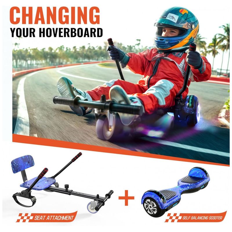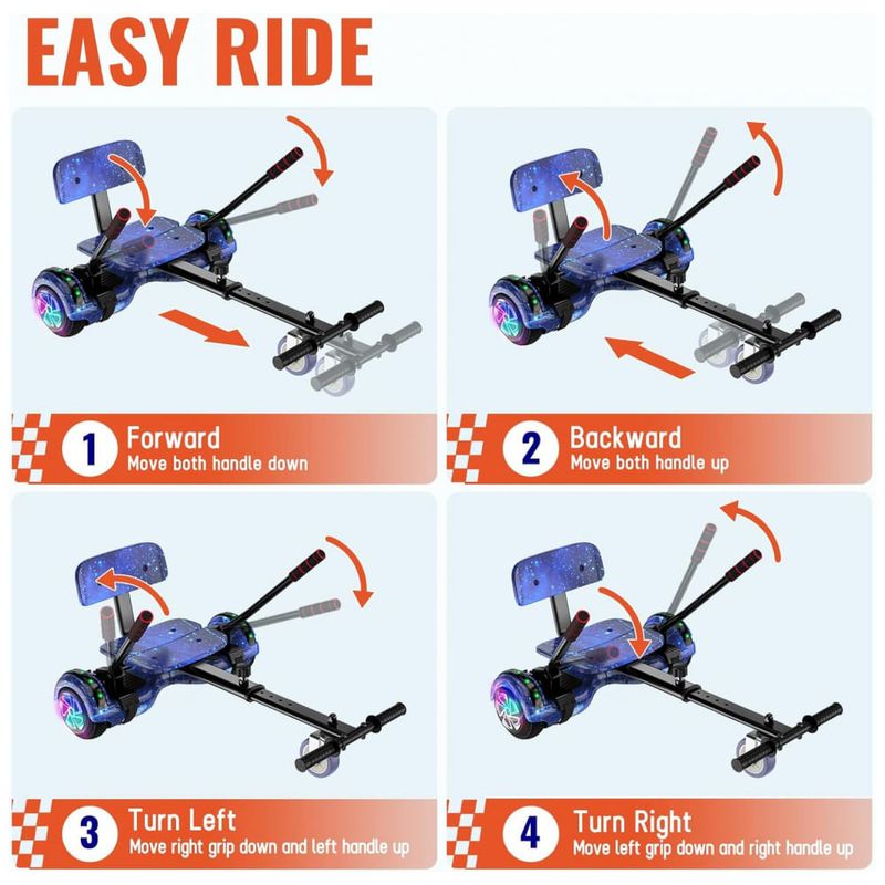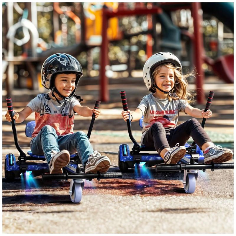 Transforme seu hoverboard em um kart divertido e confortável. O assento expansível proporciona maior agilidade e velocidade, com comprimento ajustável de 72 cm a 85 cm, ideal para crianças e adultos.