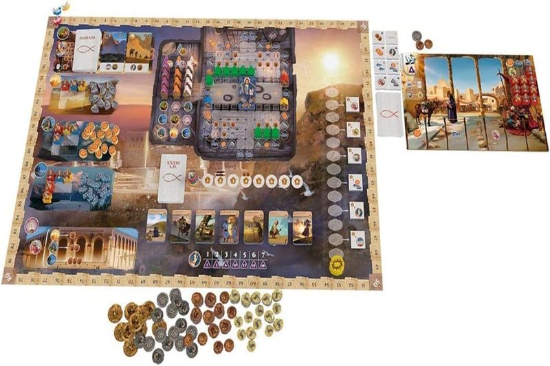 No centro do tabuleiro encontramos a sala de jantar onde se celebra a Última Ceia. Jesus está no meio e ao redor dele se sentarão os apóstolos, que no início do jogo esperam numa sala ao lado. Ao longo do jogo, os jogadores irão distribuir os 12 apóstolos e os seus próprios seguidores para tentar marcar o máximo de pontos de vitória possível, bem como obter o benefício do local em que colocarem um seguidor. Sob a sala de jantar, encontra-se o marcador de favores com as cartas do Ano 33, as mais poderosas do jogo. No fundo há as 7 parábolas, que podem ser obtidas ao longo do jogo para somar pontos adicionais na fase final. Finalmente, no lado direito, está o marcador Sinédrio, que desbloqueia recompensas conforme avança e marca o fim do jogo quando atinge o último quadrado.