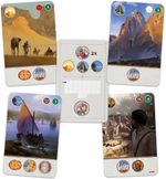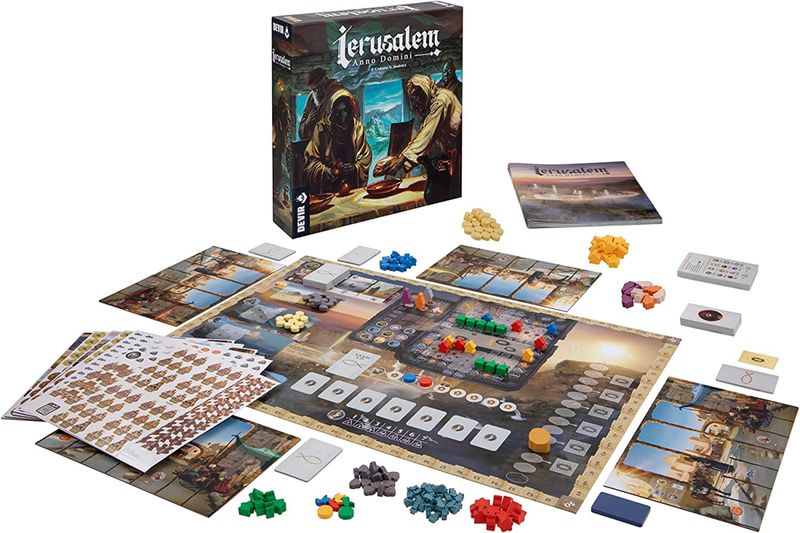 Além do tabuleiro central, em Ierusalem Anno Domini, os jogadores contam com um tabuleiro pessoal onde jogarão as cartas que têm na mão, acumularão parábolas e administrarão recursos e seguidores. Administrar bem o depósito, do lado direito, é fundamental, pois os diversos recursos, os peões dos seguidores e as fichas de oferenda dividem espaço.