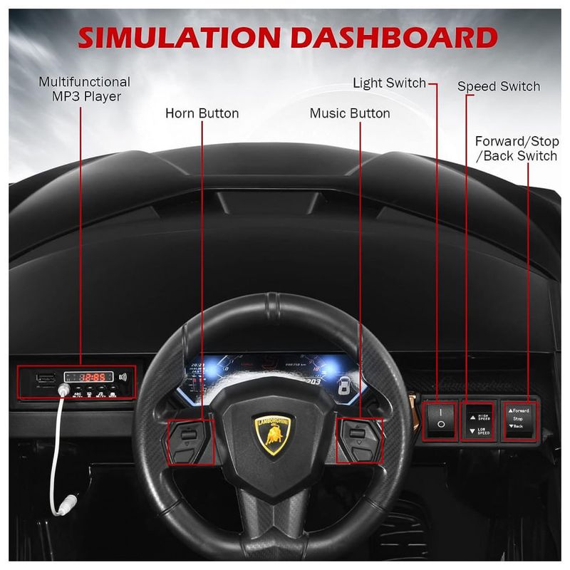LICENCIADO POR LAMBORGHINI carro licenciado da Lamborghini italiana, reduzido de acordo com o carro real da Lamborghini. A partir do conceito de design da Lamborghini, os detalhes determinam a qualidade. Passeio de alto nível de aparência no carro de brinquedo com funções completas. Adota o braço mecânico da indústria automobilística para pulverizar uniformemente, para que a superfície da pintura brilhante não desbote.