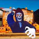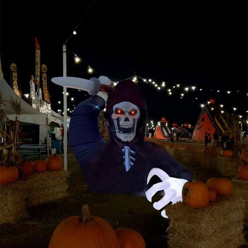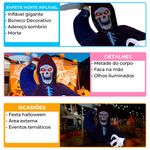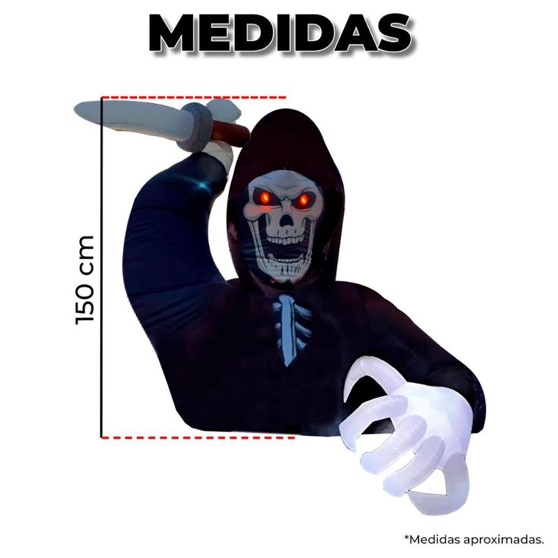 Crie uma atmosfera de arrepiar com esta decoração inflável de Halloween. Representando a morte esqueleto do torso para cima, a peça segura uma faca ameaçadora e possui olhos que brilham em vermelho, garantindo um efeito assustador em qualquer ambiente. Ideal para festas, vitrines, entradas de casas ou cenários temáticos, o inflável chama atenção pela sua presença marcante e design sombrio. Fácil de montar e destacar em ambientes internos ou externos, é o acessório perfeito para surpreender seus convidados. Inflável Quintal Olhos Iluminados Gigante 150 cm Arma Rapidamente Decoração Externa