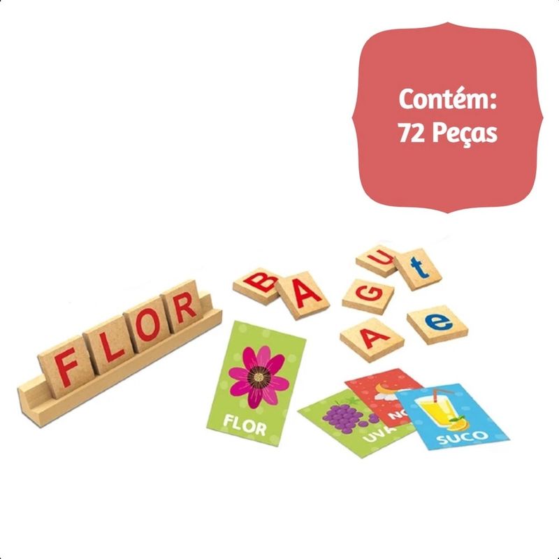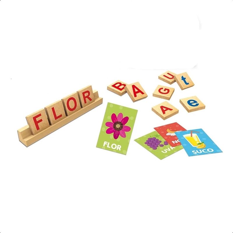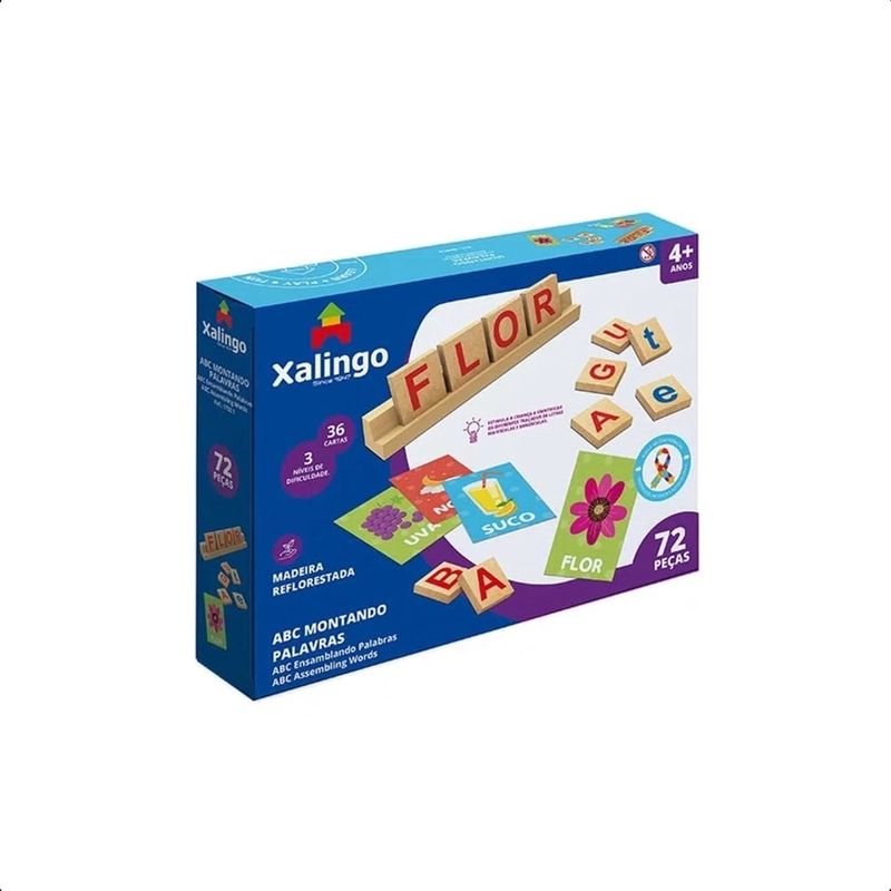 O Jogo abc Montando Palavras, da Xalingo Brinquedos, desenvolve o pensamento lógico, e a coordenação motora, além das habilidades de comparar e associar.