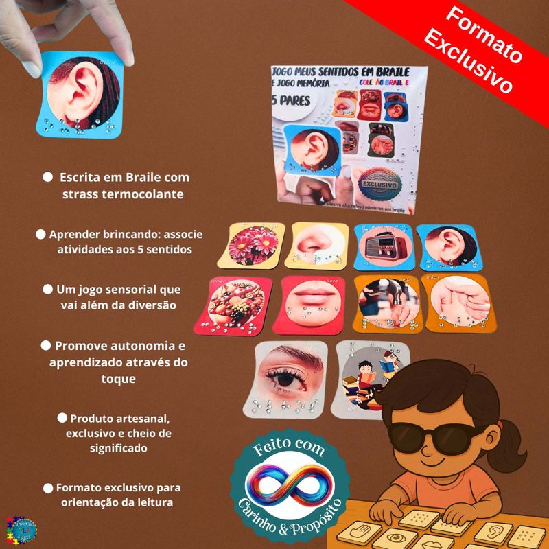Cada detalhe foi desenvolvido com atenção e afeto. As peças contam com escrita em Braile feita com strass termocolante, garantindo não apenas durabilidade e resistência ao toque, mas também um toque especial de beleza e textura que valoriza o tato e a estética. O jogo convida o jogador a associar diferentes atividades do cotidiano aos cinco sentidos – tato, olfato, visão, paladar e audição – promovendo o raciocínio lógico, a memória e o entendimento do mundo ao redor de forma lúdica e afetiva.
