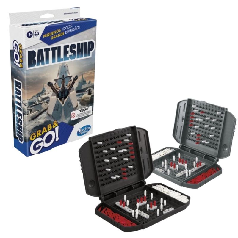 Jogabilidade clássica em formato de bolso. Este jogo pode ser levado para jogar onde quiser. Esta versão usa as mesmas regras do jogo Battleship original. O jogador deve afundar a frota de 5 navios do inimigo antes que ele afunde a sua. Os jogadores devem posicionar todas as suas unidades navais estrategicamente e tentar fazer lançamentos precisos contra a frota do inimigo. Para crianças a partir dos 7 anos. O jogo Battleship Grab & Go para 2 jogadores é uma excelente opção para passar o tempo em viagem de avião, comboio ou carro, além de acampamentos e férias. É fácil de preparar e de guardar. Depois do jogo, basta guardar as peças nos estojos. Quem comandará os oceanos do jogo Battleship Grab and Go?