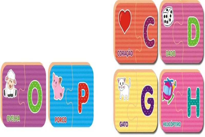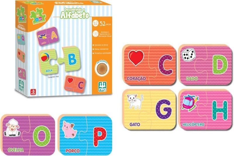 Aviso: Imagens meramente ilustrativas!!!Material didático para crianças em fase pré-escolar; indicado nas listas de material das escolas. Esse jogo traz a associação de cada letra do alfabeto ao objeto que começa com a mesma letra. Encaixes diferentes. Contém 52 peças grandes em madeira reciclada, coloridas e resistentes.Contém: 52 PeçasIdade: 4+ anosMaterial: Madeira ReflorestadaMarca: Nig Brinquedos