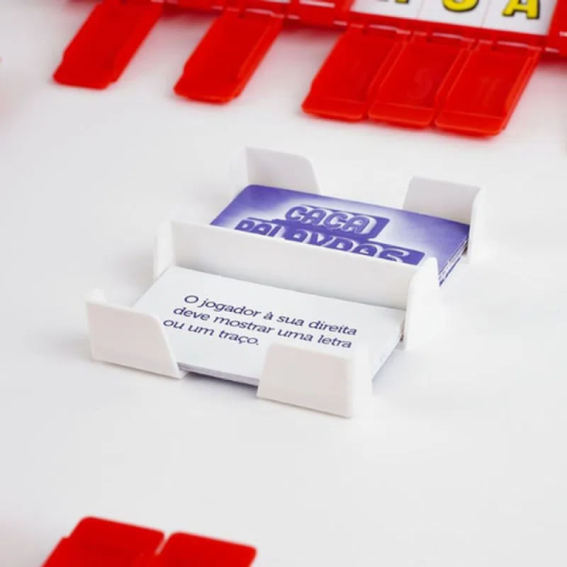 Cada jogadores deve escrever uma palavra oculta na sua estante de letras. Em seguida, cada jogador deve dizer uma letra que acredita que esteja escondida na estante do adversário. Se a letra fizer parte da palavra escolhida o jogador deve deixala à mostra. Mas tome cuidado para não se iludir afinal o jogador só precisa mostrar uma letra de cada vez! Boa memória, percepção e muitas risadas te aguardam nesse divertido jogo de palavras.