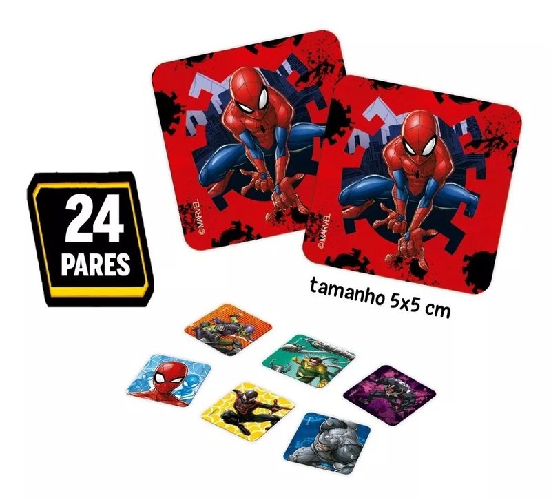 Jogo da Memória Homem-AranhaMarca do produto: Toyster.Um incrível Jogo da Memória com 24 pares de peças do filme Homem-Aranha.Estimule a memória e a concentração das crianças com o encantador Jogo da Memória do Filme Homem-Aranha! Inspirado nos adoráveis personagens da animação de sucesso, este jogo é ideal para crianças a partir de 4 anos de idade. Com 24 pares de peças coloridas e vibrantes, os pequenos poderão se divertir encontrando as correspondências dos personagens.Cada partida é uma oportunidade de desenvolver habilidades cognitivas enquanto mergulham no mundo do Homem-Aranha. Perfeito para brincar sozinho ou com amigos, proporcionando momentos de aprendizado e diversão.Especificações TécnicasFaixa Etária: A partir de 4 anosComponentes: 24 pares (48 peças).Dimensões das Peças: 5,5cm x 5,5cm