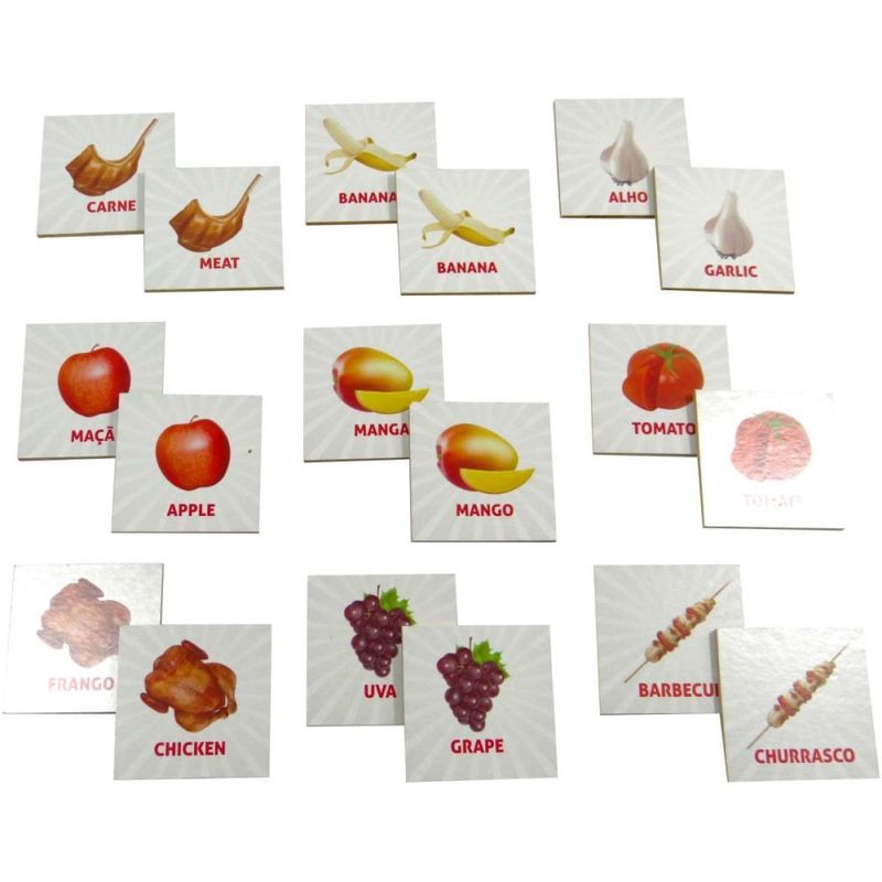 Divertido jogo da memória que ensina e desenvolve a aprendizagem em inglês utilizando as frutas. Produzido em madeira M.D.F.