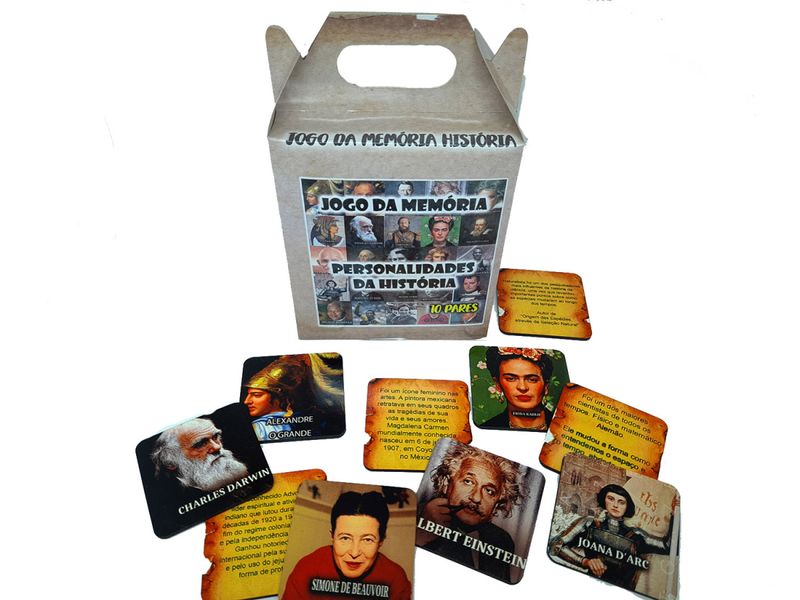 Este jogo não é um simples jogo da memória, onde voce vira as peças e se achar a igual você ganha...Não não não, você vai aprender com este jogo que, ao virar a peça sobre uma personalidade, o seu par será o que ele fez, ou seja, a outra peça terá descrito seus feitos e você deve saber se este feito é desta personalidade ou não.