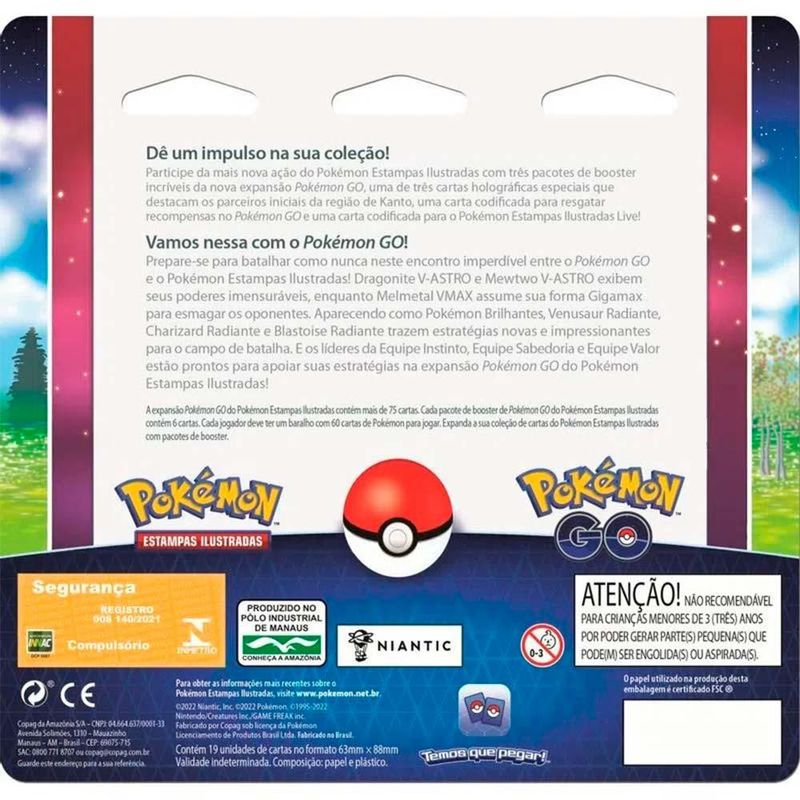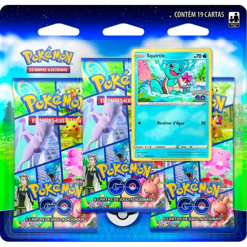 Jogo de Cartas - Pokemon Go - Blister Triplo - 19 Cartas - Squirtle - Copag: De um impulso na sua colecao! Participe da mais nova acao do Pokemon Estampas Ilustradas com tres pacotes de booster incriveis da nova expansao Pokemon Go, uma de tres cartas holograficas especiais que destacam os parceiros inicias da regiao de Kanto, uma carta codificada para resgatar recompensas no Pokemon Go e uma carta codificada para o Pokemon Estampas Ilustradas Live! Vamos capturar todos! • Detalhes - Pratico, chamativo e divertido - 19 otimas cartas para sua colecao - Variacoes de cartas e estrategias - Linda combinacao chamativa de cores - Materiais confeccionados de alta qualidade - Colecao exclusiva do Pokemon Go - Carta promocional de Squirtle, Pokemon de agua sendo um dos 3 Pokemon primarios mais conhecidos - Embalagem inteiramente inspirada nos Pokemon do Pokemon Go - Cartas raras promocionais - Tipo de rareza: Promocional INFORMACOES: • Produto: Bister Triplo Pokemon Go Squirtle • Colecao: Pokemon Go • Marca: Copag • Cores: Estampado • Tipo: Jogo de Baralho • Categoria: Jogo de Cartas • Dimensoes (Carta) (C x A): 63 x 88 mm • Conteudo: 19 unidades de cartas pokemon • Cada jogador deve ter um baralho de 60 cartas de Pokemon para jogar. • Recomendacao: para criancas maiores de 04 anos de idade ESPECIFICACOES: • Referencia: 31339 • Codigo de Barras: 7896192313386 • Embalagem (C x A x L): 19 x 19 x 0,8 cm • Embalagem (Peso): 0,070 kg • Material / Composicao: Papel cartonado • Registro: 008 140/2021 • Certificado: Orgaos Autorizados - OCP´S (Organismos de Certificacao de Produtos) BENEFICIOS DE BRINCAR: - Eleva a autoestima - Exercita a memoria - Estimula o raciocinio - Exercita o imaginario - Desenvolve a criatividade - Desenvolve percepcao visual - Desperta a atencao e curiosidade - Desenvolvimento neuropsicologico - Estimula habilidades motoras basicas - Incentiva a comunicacao e linguagem - Desenvolve aspectos emocionais e afetivo - Estimula o reconhecimento de formas e cores AVISO: - As imagens sao meramente ilustrativas - Os tamanhos e medidas sao aproximados - As cores e estampas dos produtos podem ter variacoes - As informacoes sao de responsabilidade do fabricante ou fornecedor